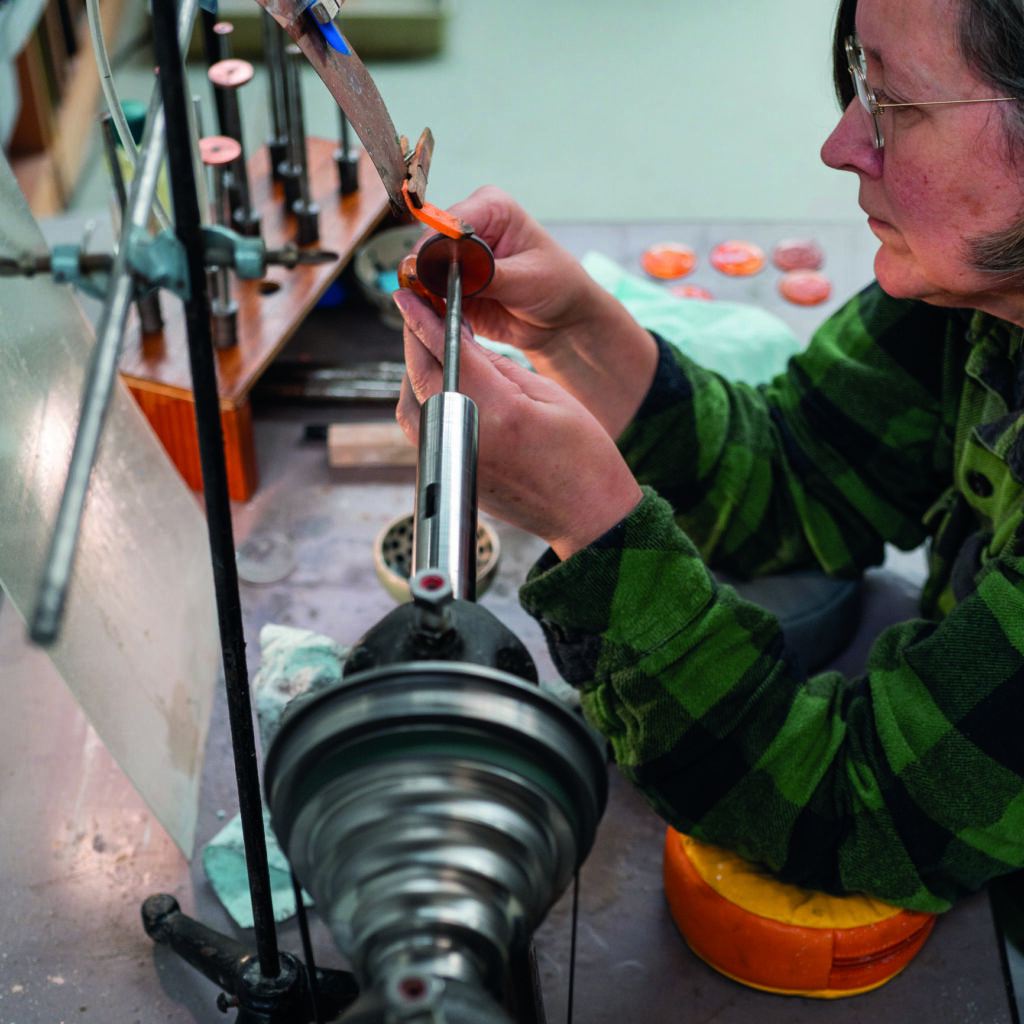 Als deelnemer probeer de graveermachine uit, voel je aan het glas om vertrouwd te raken met het materiaal en het aandrukken van het glasplaatje tegen de graveernaald. - Echt graveren van eigen ontwerp
